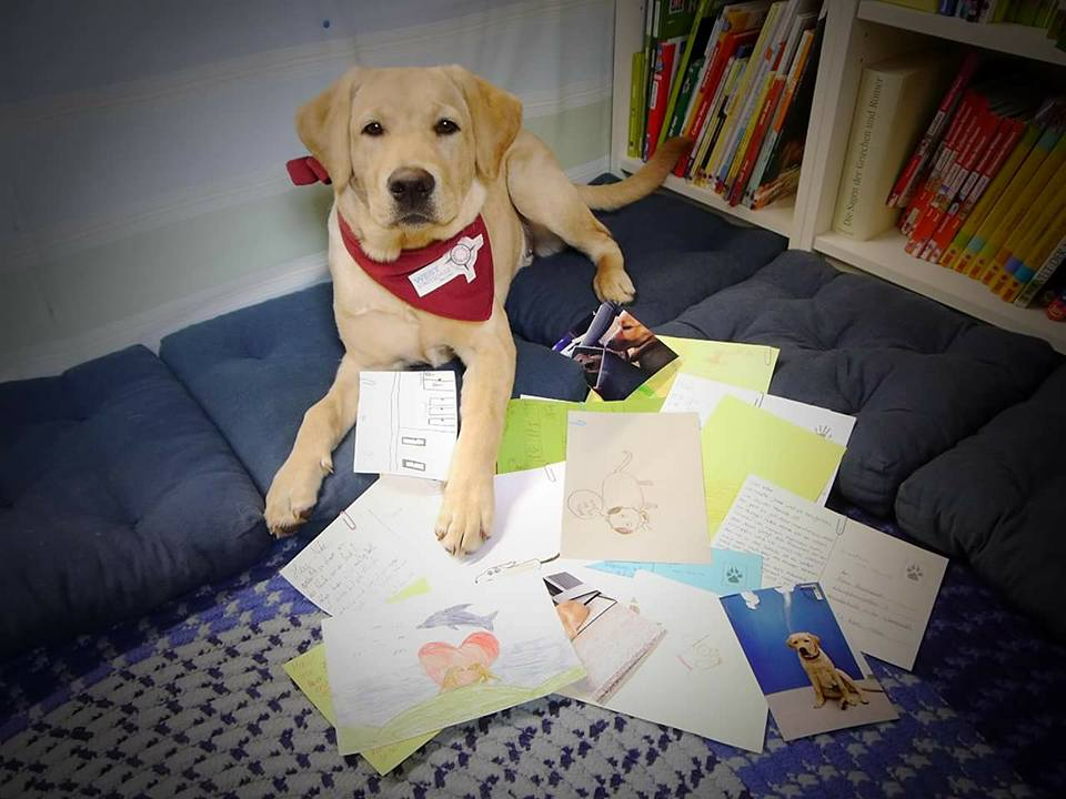 - Leseförderung: Eywa und Nike sind regelmäßig Teil der Schülerbücherei-AG, sorgen dort für Ordnung und Ruhe, hören den Kindern beim Lesen zu (beide oder auch nur eine von beiden werden zudem demnächst auch andere Einrichtungen als Lesehund besuchen). Wenn die Leseförderung in meinem Unterricht stattfindet, lesen die Schüler in einem selbstgewählten Buch, die Hunde hören leise und urteilsfrei zu. Anschließend hat jedes Kind ein Lesetagebuch, welches stetig fortgeführt wird und natürlich auch von Eywa und Nike begleitet wird