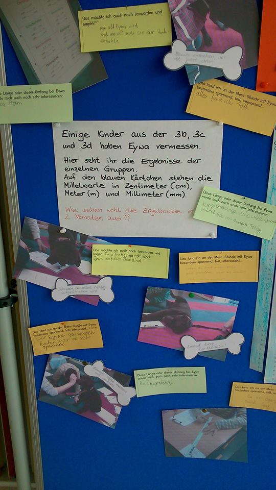 Da die Kleine inzwischen mit beiden Gruppen der dritten Klassen so gut klarkommt und sich dort völlig frei bewegen darf und kann, wird sie mal vermessen (in beiden Klassen werden Längen und Umrechnungen wiederholt bzw eingeführt).