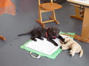 Morgen wird sie wieder für einige Zeit mitkommen, dann allerdings die ersten beiden Stunden zur "Hundebetreuung" ins Sekretariat (nach kurzer Runde, Fütterung und wiederholter Runde wird sie diese Zeit wohl eher verschlafen) und nach der Pause für zwei Unterrichtsstunden wieder bei mir.