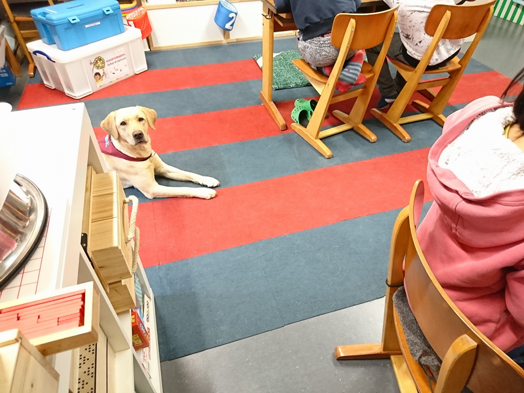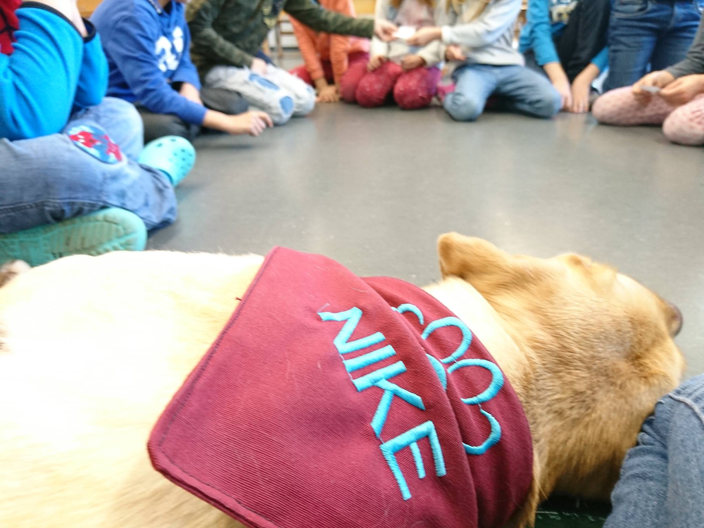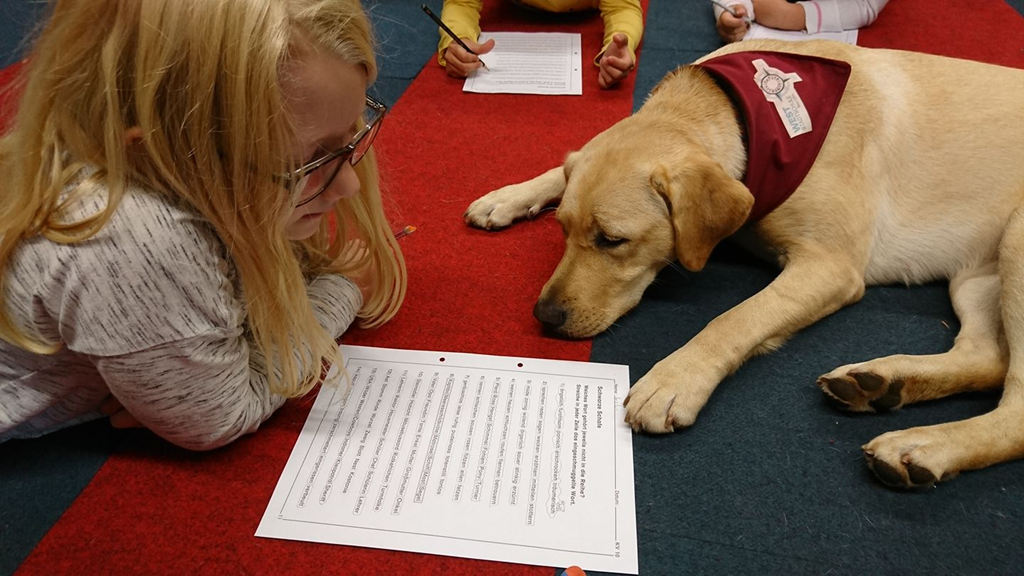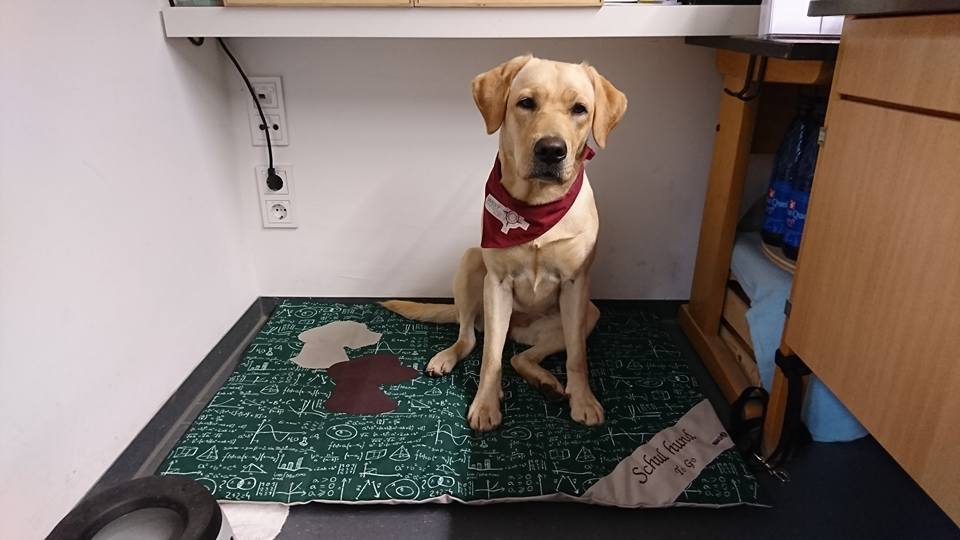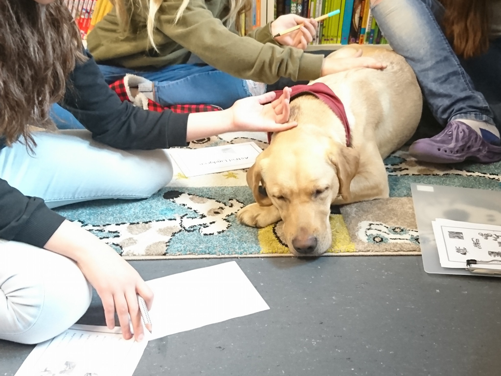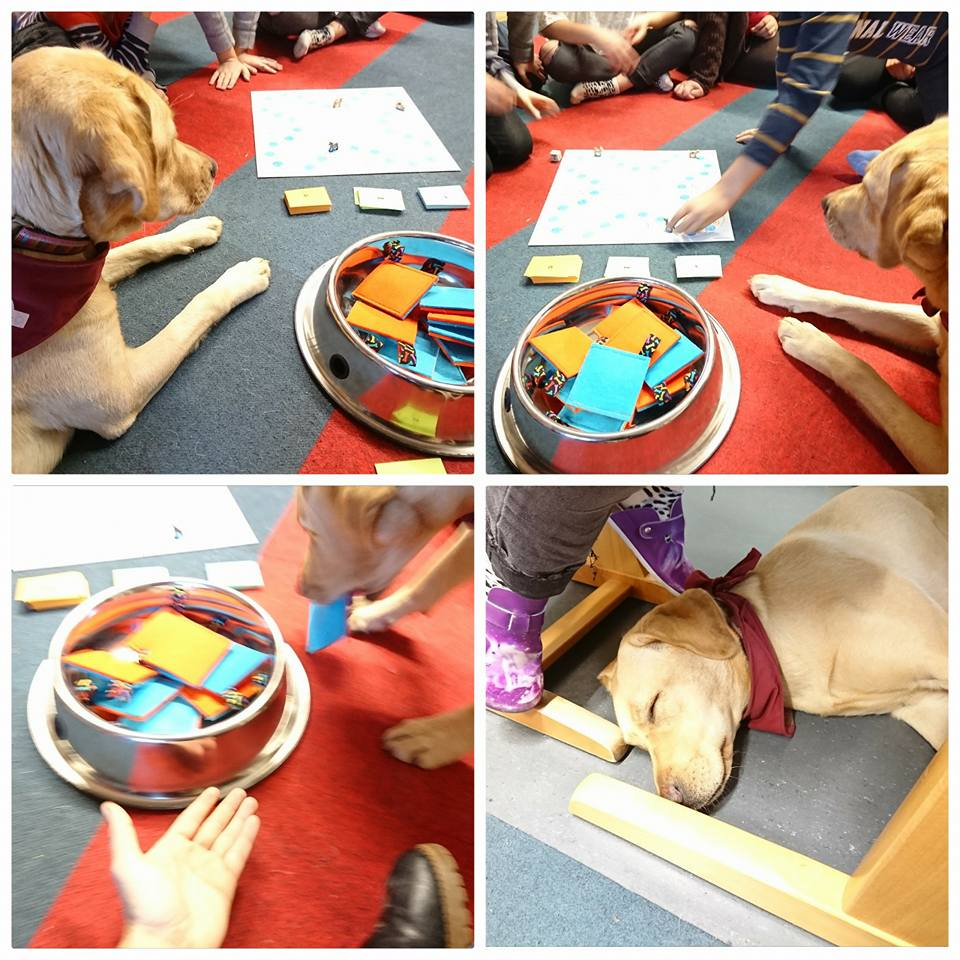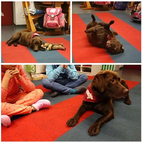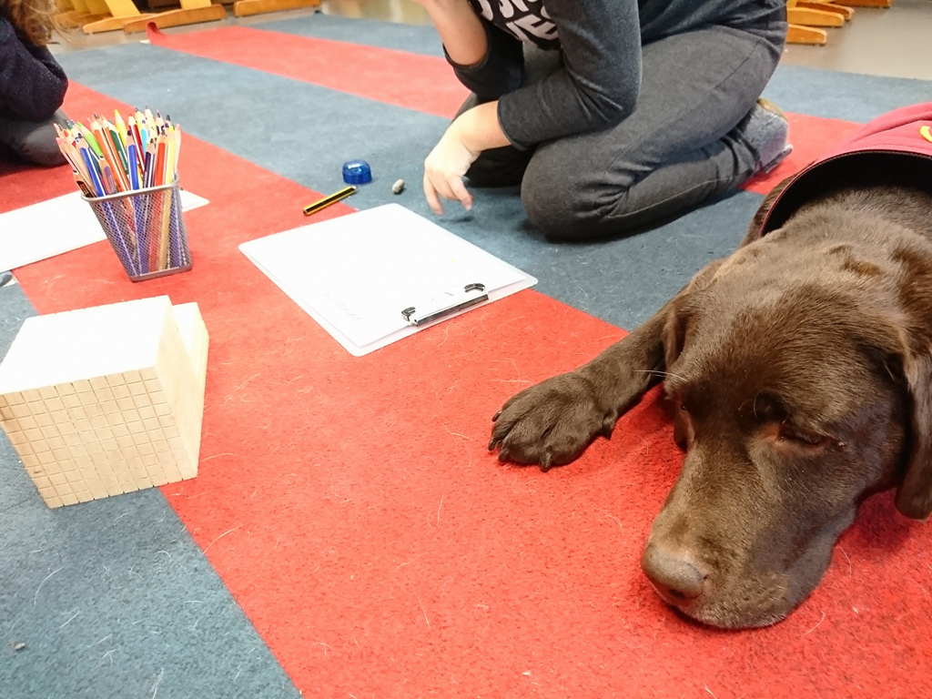Und Nike nahm ihren Aufsichtsjob sehr ernst. Zu Beginn beruhigte sie die aufgeregten Schülerinnen des einen Gruppentischs und legte sich zu deren Füßen ab.