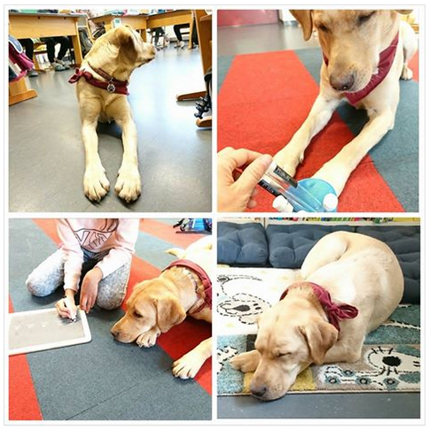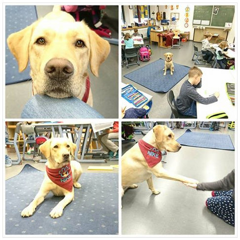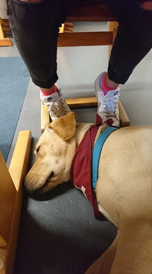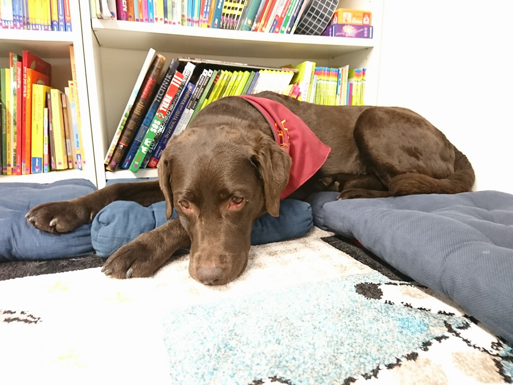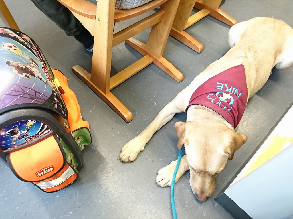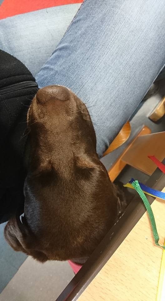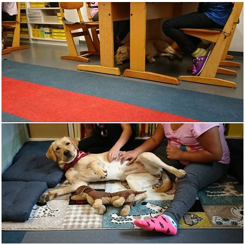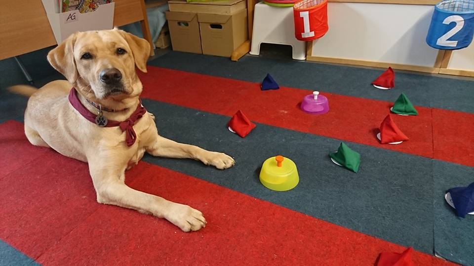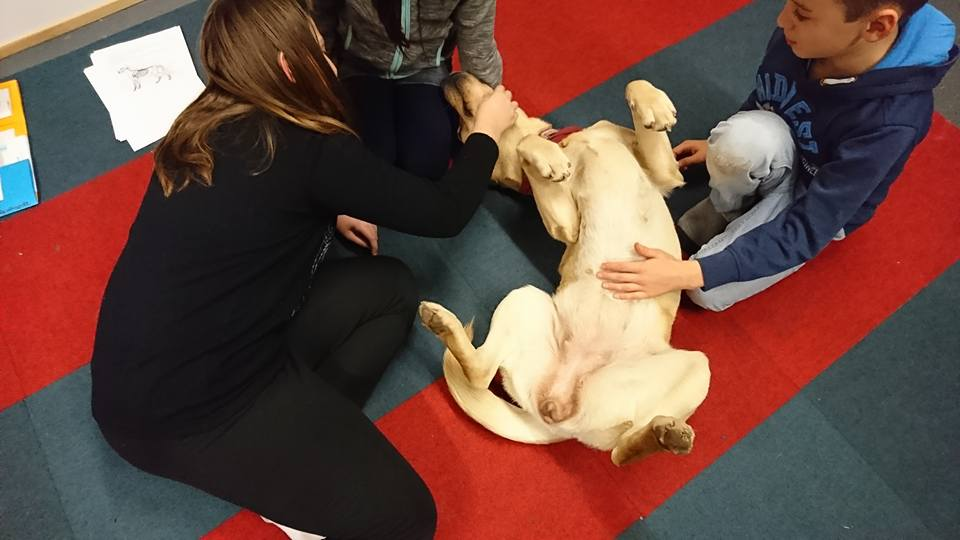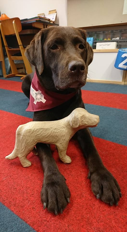 Und Nike nahm ihren Aufsichtsjob sehr ernst. Zu Beginn beruhigte sie die aufgeregten Schülerinnen des einen Gruppentischs und legte sich zu deren Füßen ab.