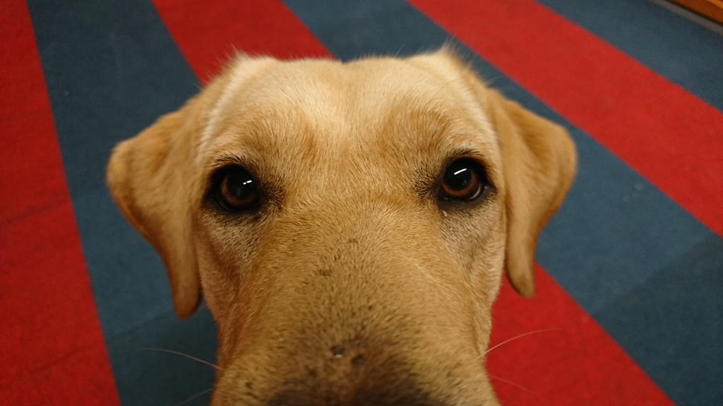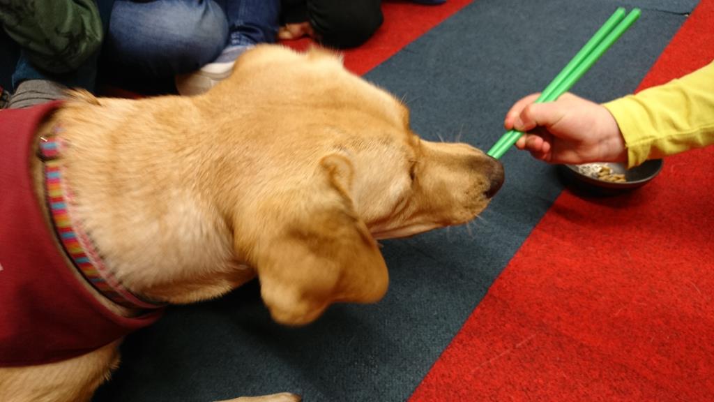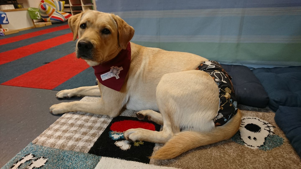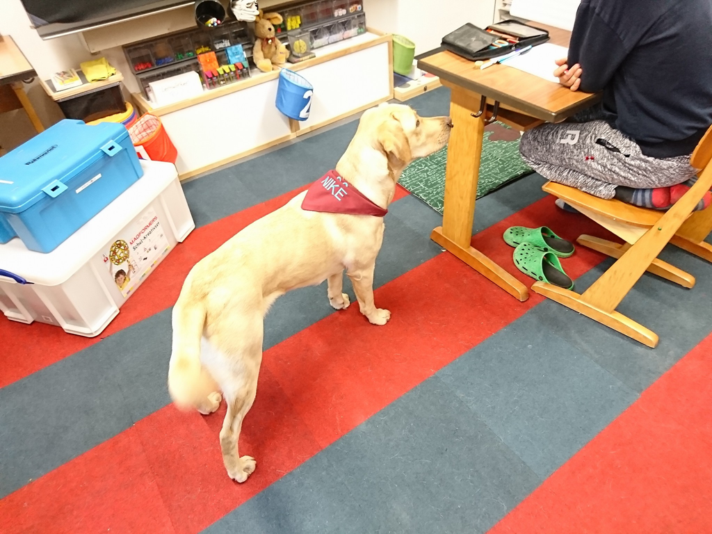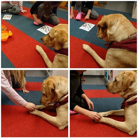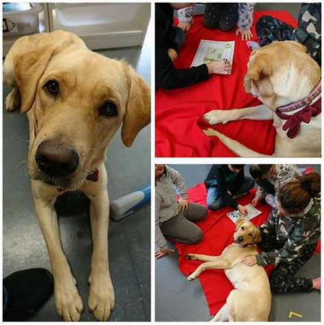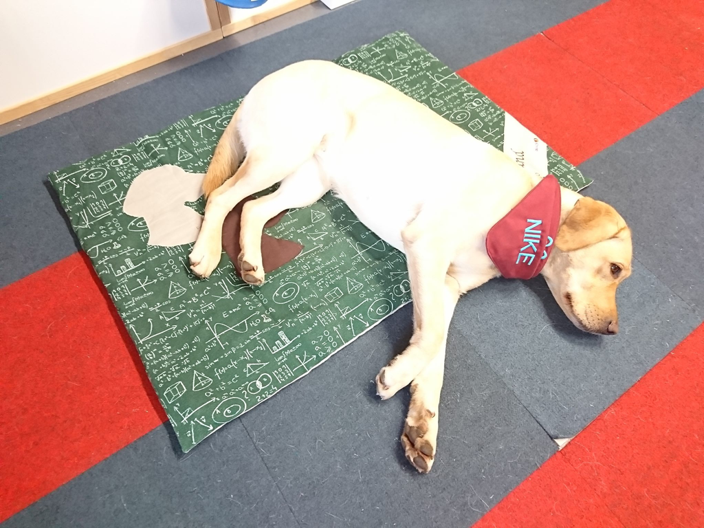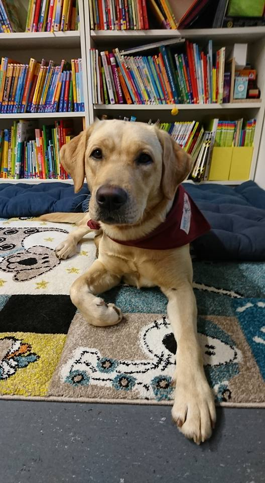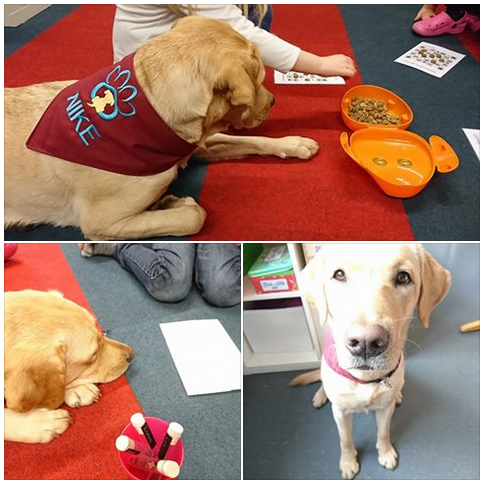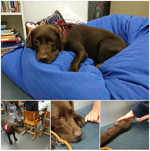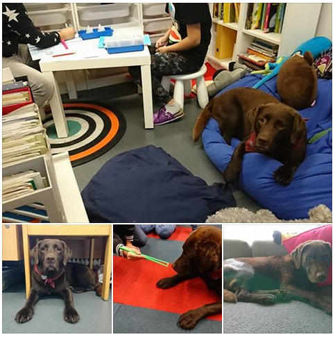 Und Nike nahm ihren Aufsichtsjob sehr ernst. Zu Beginn beruhigte sie die aufgeregten Schülerinnen des einen Gruppentischs und legte sich zu deren Füßen ab.