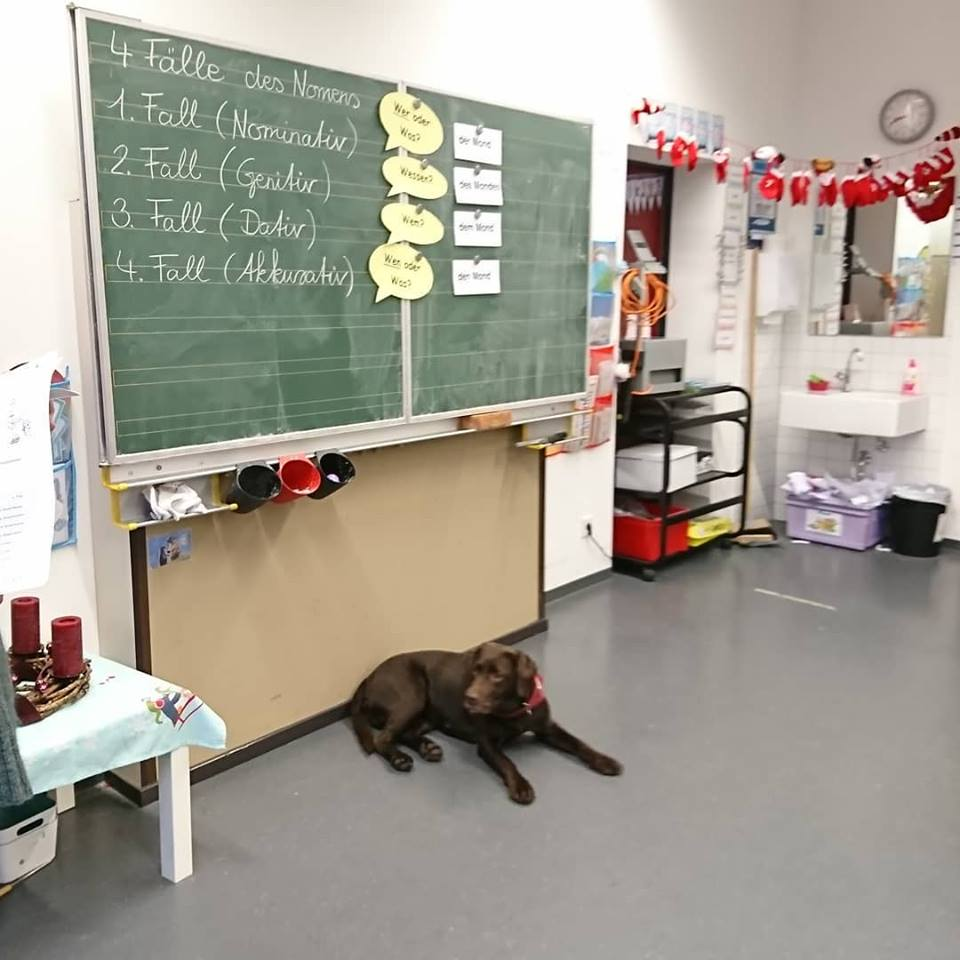 In der ersten Stunde durfte sich das Stinkedi nochmal in ihrer "Kellerbox" auf die Seite legen, in der zweiten Stunde leistete sie dann der Ganztagesklasse und der Tandemkollegin und natürlich mir Gesellschaft. Für die Kinder war nach der Pause eine Probe angesetzt und dadurch waren alle natürlich aufgeregt und hibbelig. Doch was macht mehr Mut und schenkt mehr Vertrauen als ein weiches Hundefell und gutgläubige Nikeglubscher? NIXN, also war das das Beste für die Klasse, um sich nochmal zu sammeln, aber auch den Inhalt der aktuellen Stunde aufzunehmen.
