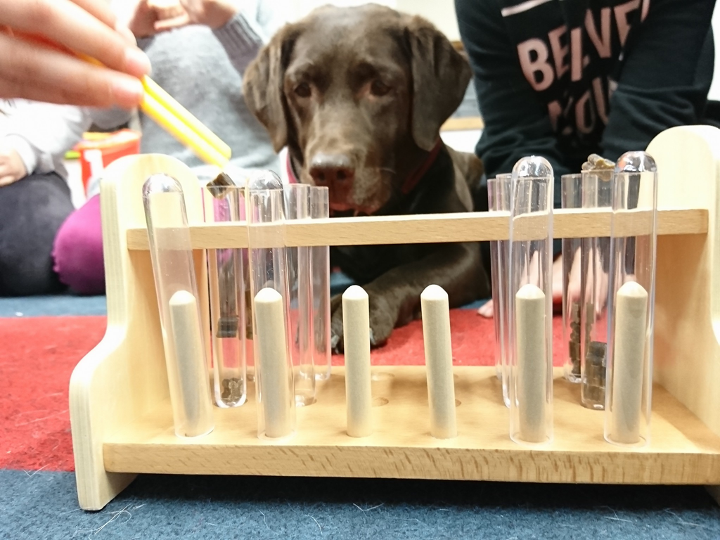 In der späteren Mathestunde durfte Madame dann noch zeigen, wie sie mit den neuen Einsatzdummys umgehen kann. In diesen befanden sich nämlich unterschiedliche Körper (welche mit Rechteck oder Quadrat und welche mit einem Kreis als Grundfläche). Eywa durfte die Dummys nacheinander apportieren, die Kinder belohnten mit einem Leckerli und sollten daraufhin die verschiedenen Körper benennen (Wiederholung).